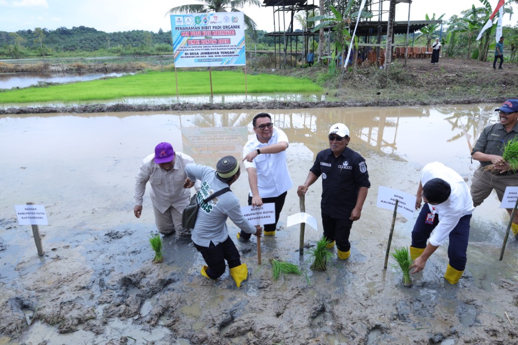 Tenggarong – Selain melakukan peletakan batu pertama pembangunan Kantor Desa Jembayan Tengah dan sejumlah agenda lainnya, Bupati Kutai Kartanegara (Kukar) Aulia Rahman Basri juga melaksanakan penanaman bibit padi organik di lahan persawahan milik BUMDes Bauntung Batuah Desa Jembayan Tengah, Kecamatan Loa Kulu, Selasa (2/12/2025).