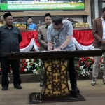 Di penghujung acara, Bupati Kukar bersama Ketua dan unsur pimpinan anggota DPRD Kukar, melakukan penandatanganan berita acara. _(prokom05)_